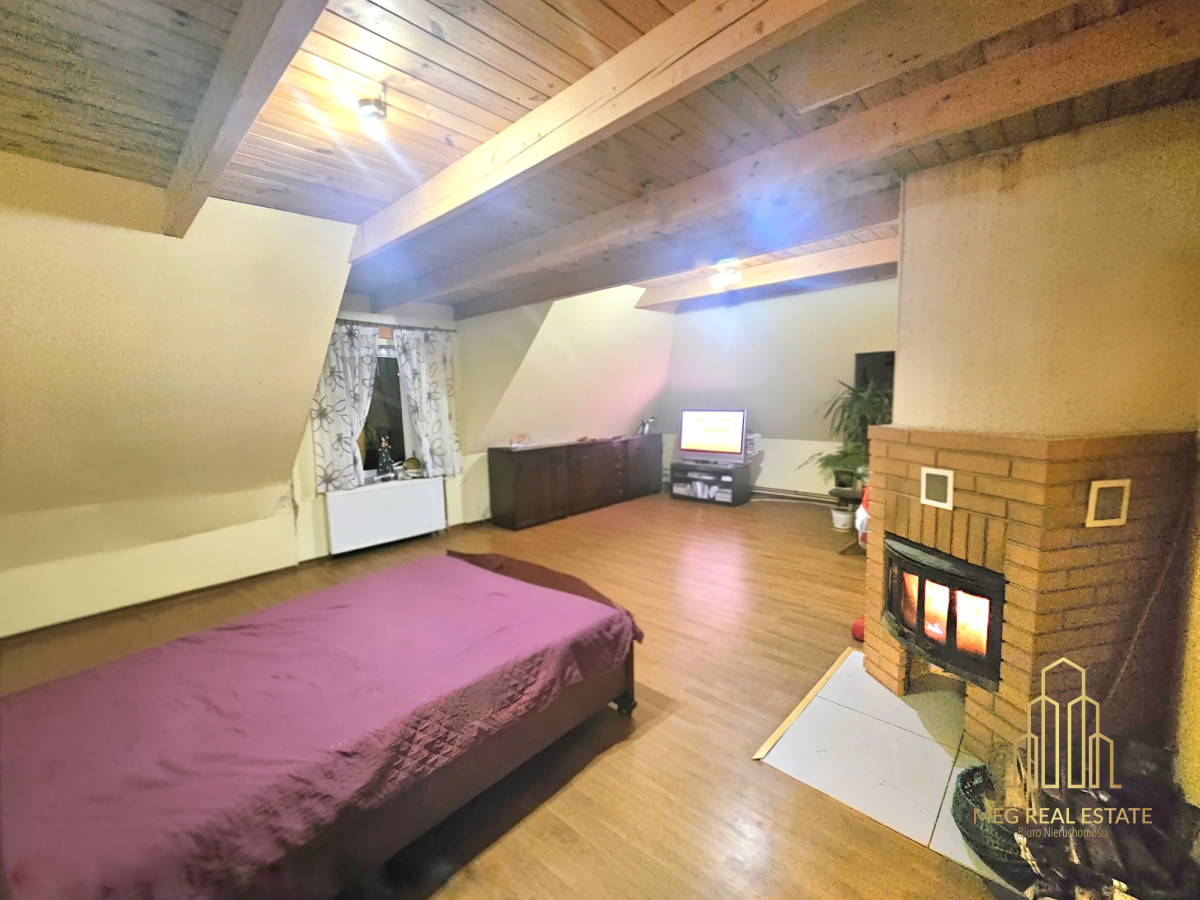 Poddasze użytkowe (jest dobrze docieplone) posiada 3 sypialnie, dwie o metrażu około 25 m2 z garderobą oraz trzecia, małżeńska z kominkiem i garderobą o metrażu ok. 50 m2. Jeżeli jest taka potrzeba, tę przestrzeń można podzielić na osobne pokoje.
