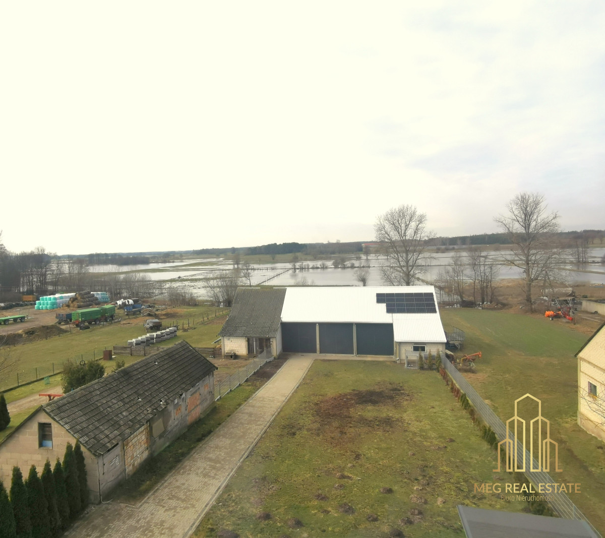 Garaż/budynek gospodarczy o wymiarach 20 m x15 m, czyli 300 m2 został pokryty w 2020 roku nową blachą trapezową. Wstawiono 3 wysokie, ok. 5 metrowe uchylne bramy garażowe z przodu budynku i 1 bramę z tyłu budynku, aby mogły wjechać pod dach samochody ciężarowe oraz wszelkie maszyny rolnicze, np. kombajn, ciągnik itp.