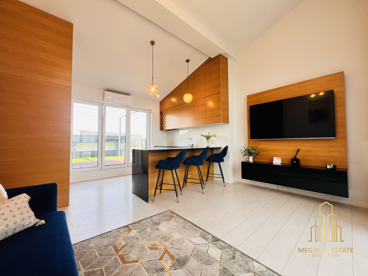- przestrony salonu dużymi przeszkleniami i wyjściem na duży, słoneczny taras,