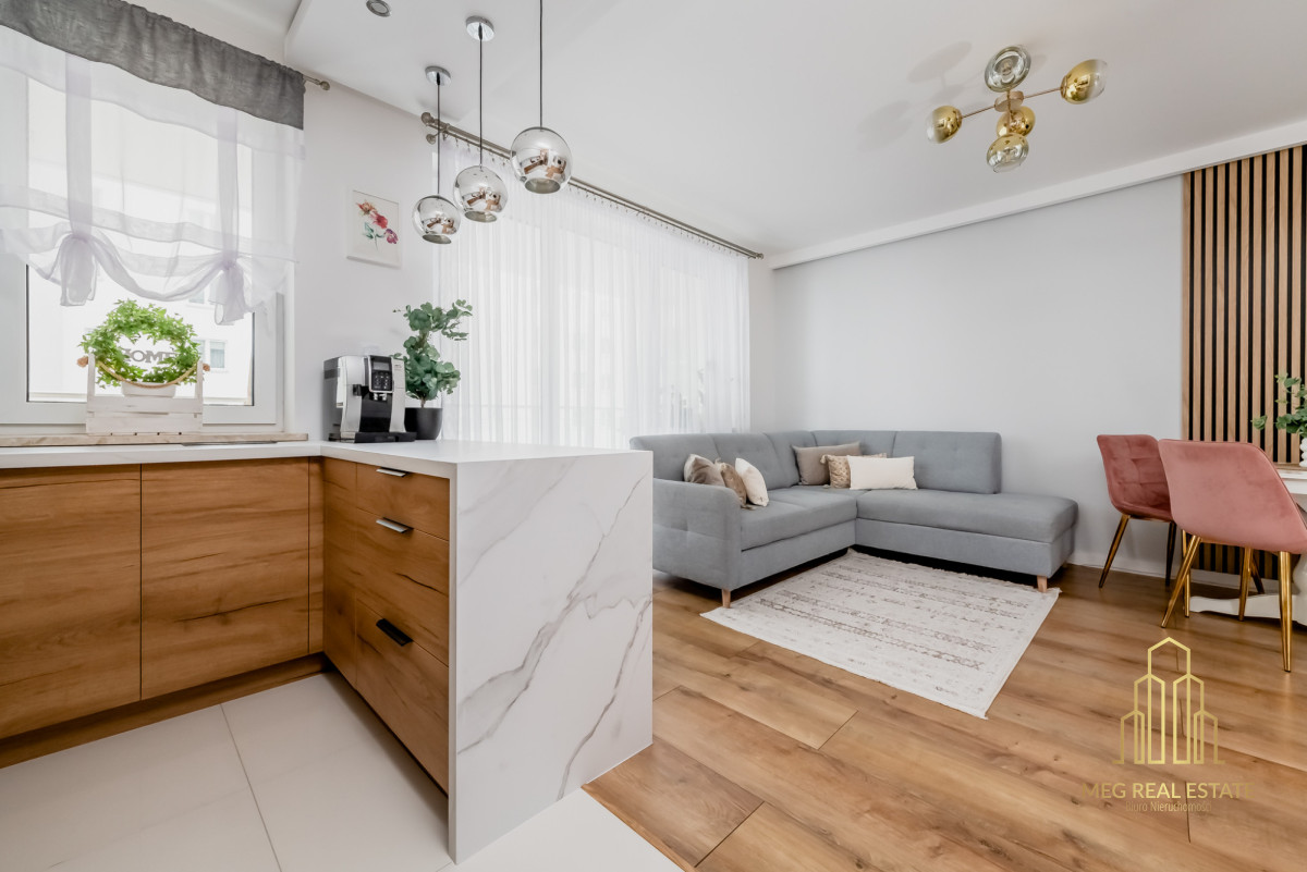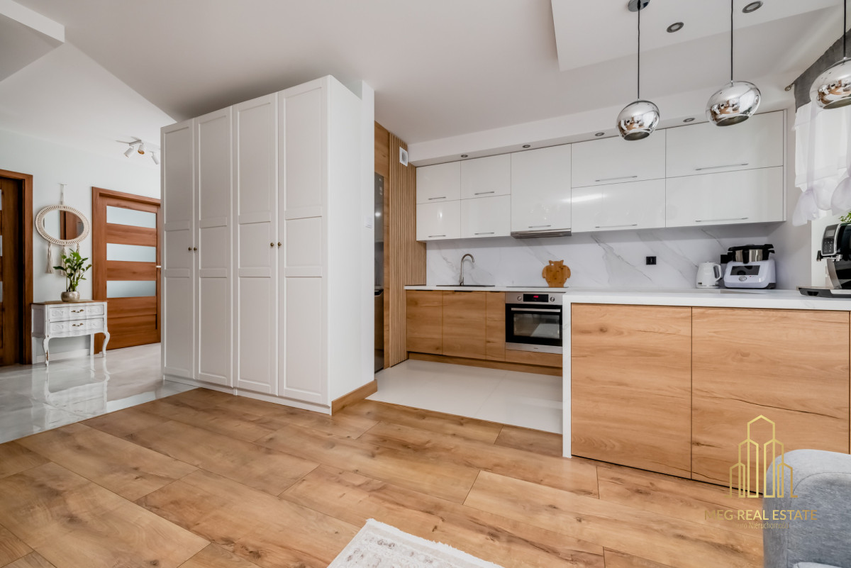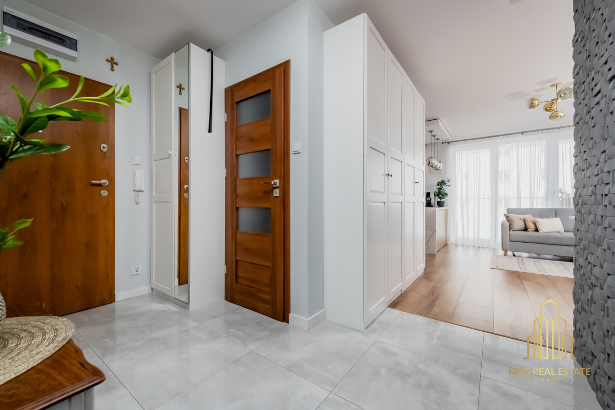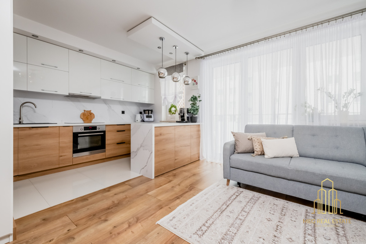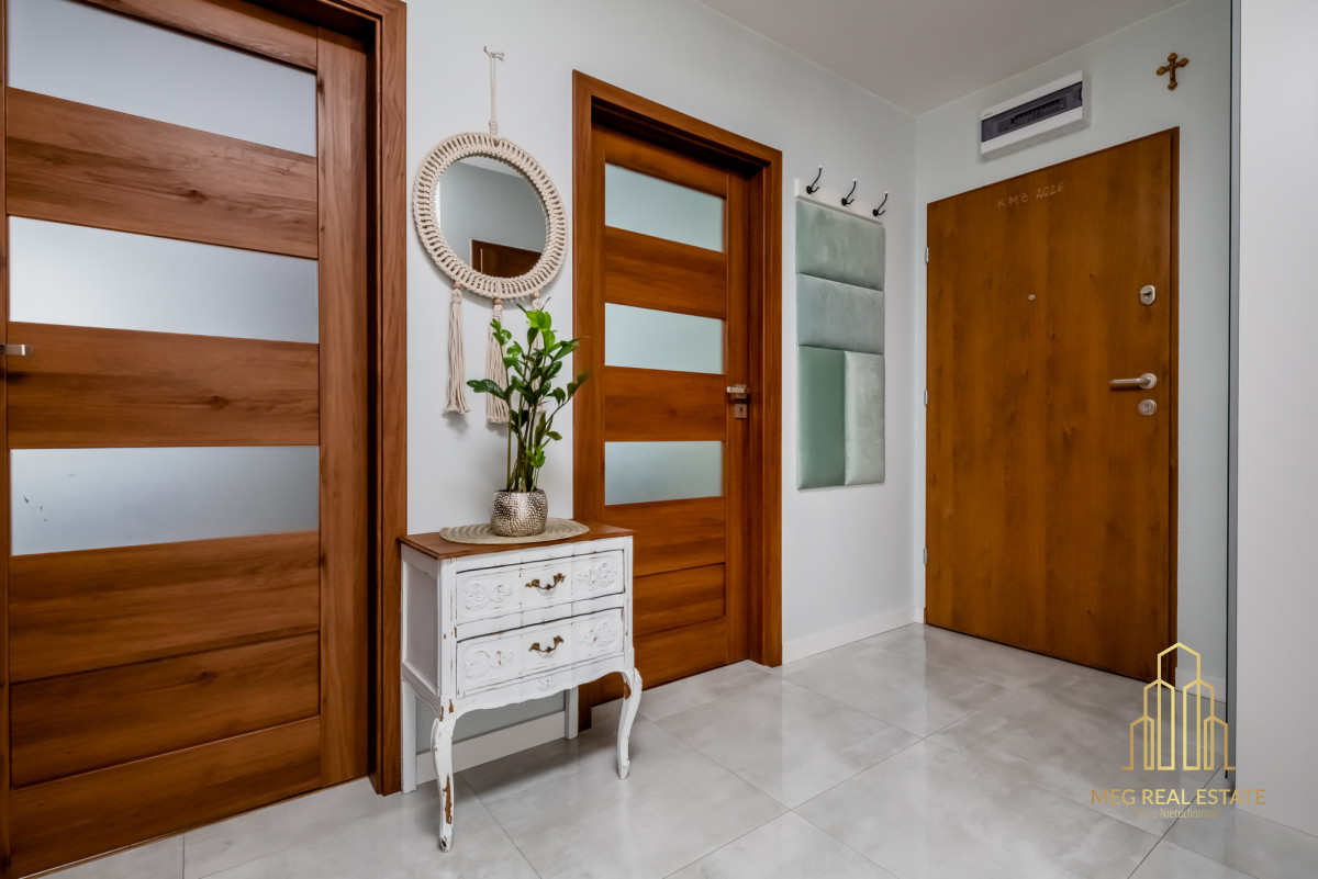 Meg Real Estate zaprasza na prezentację mieszania na sprzedaż dopracowanego w każdym detalu, położonego na 1. piętrze nowoczesnego budynku z windą z 2019 roku.