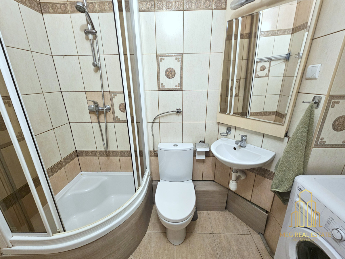 * łazienka z wc z prysznicem i umywalką. Wyposażona jest w pralkę i szafki;