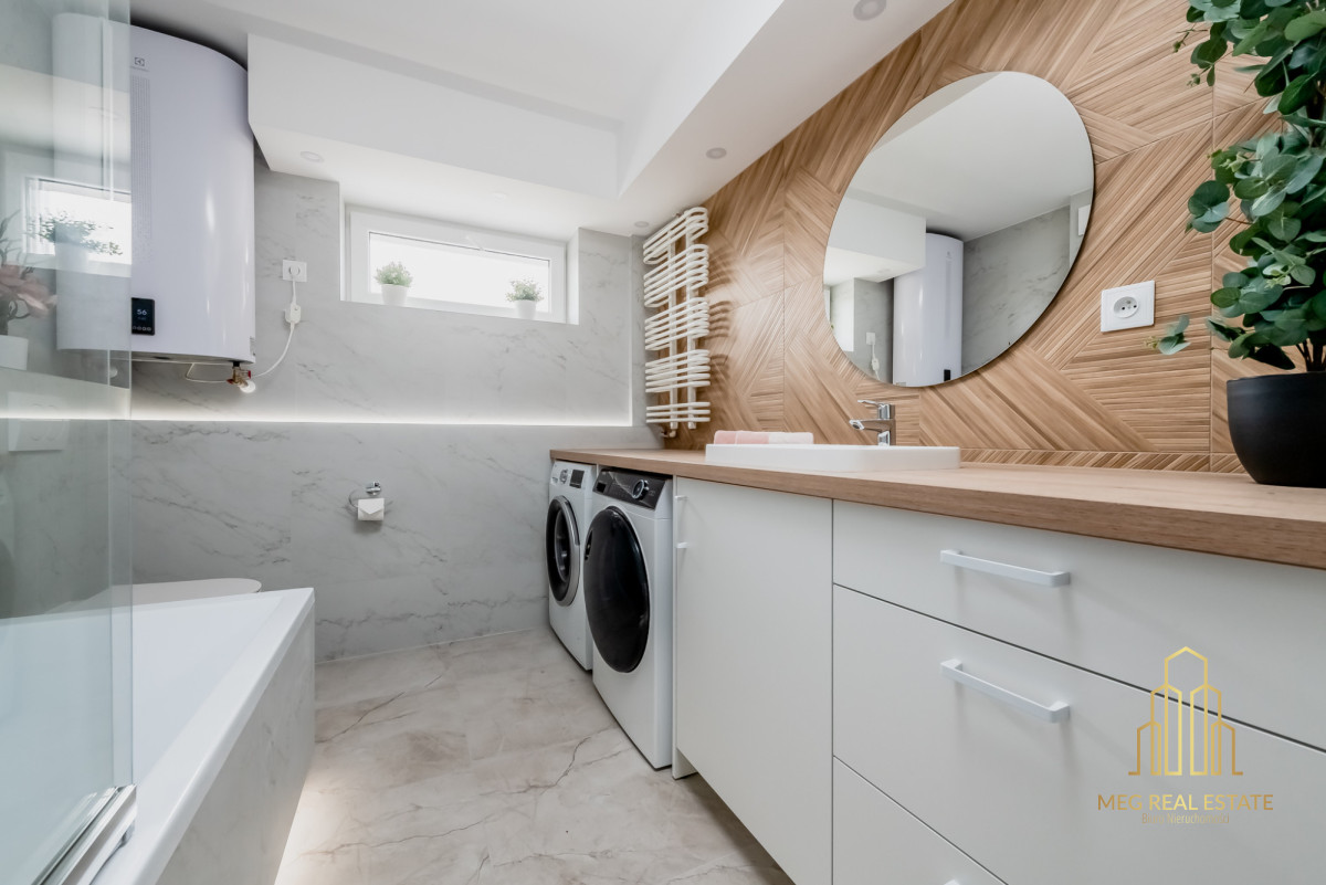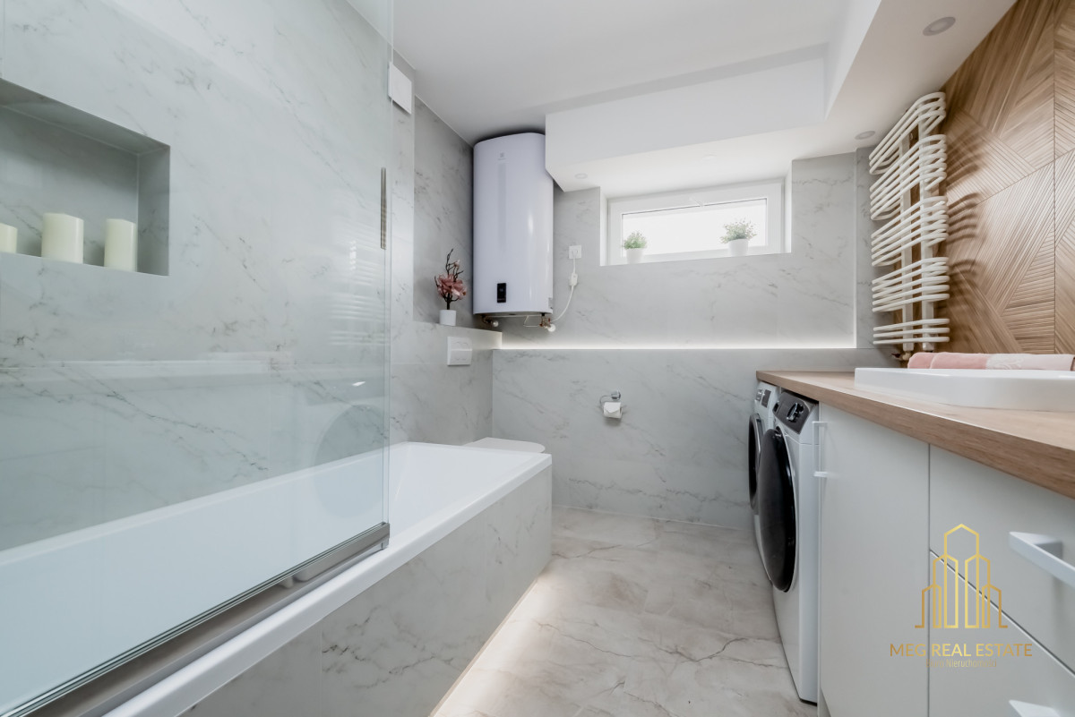 -łazienka z wanną, pralką i suszarką,