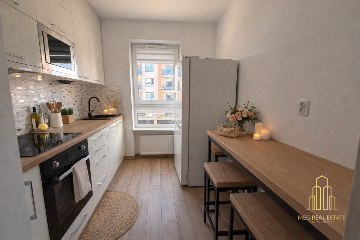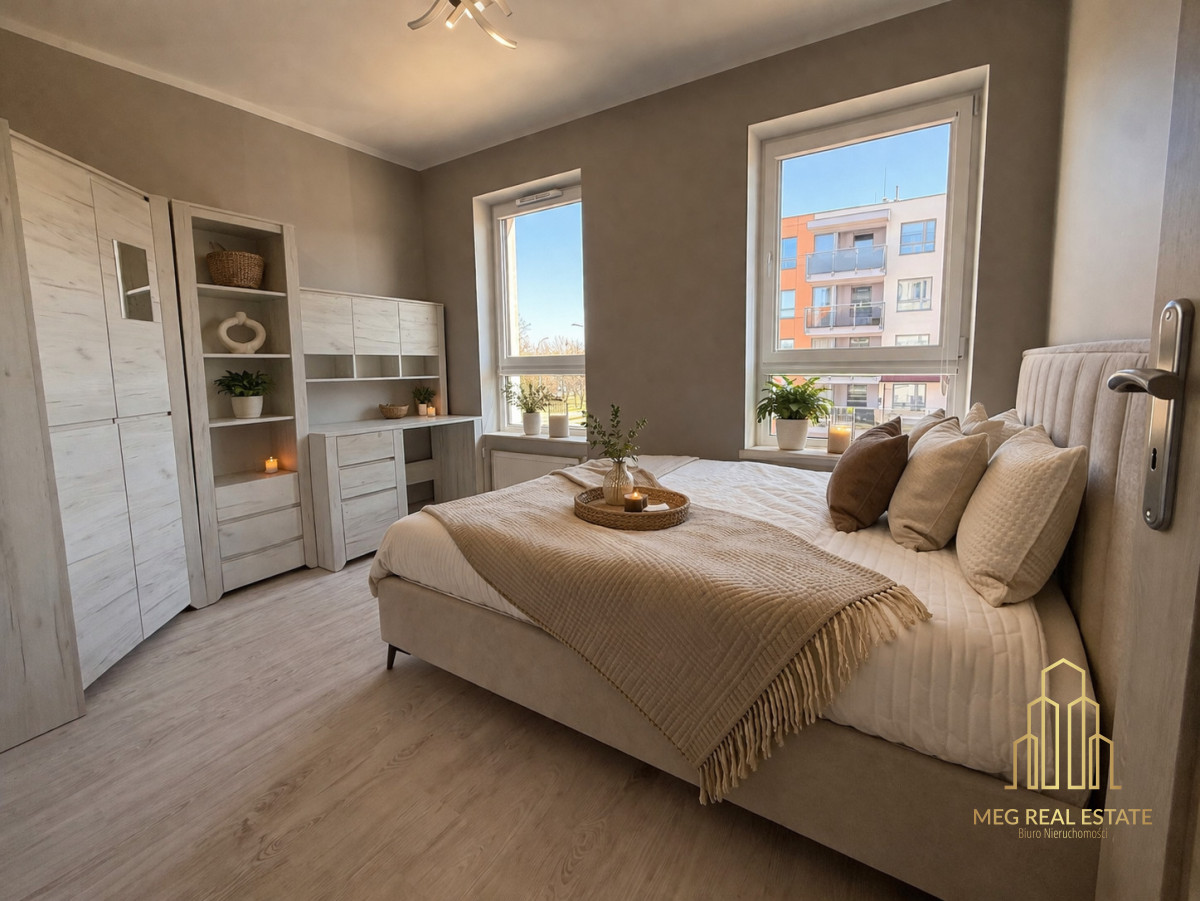 Mieszkanie składa się z przestronnego salonu, oddzielnej kuchni, sypialni, łazienki z pojemnymi szafkami, przedpokoju z duża zabudową, oraz dużego balkonu z widokiem na miasto.