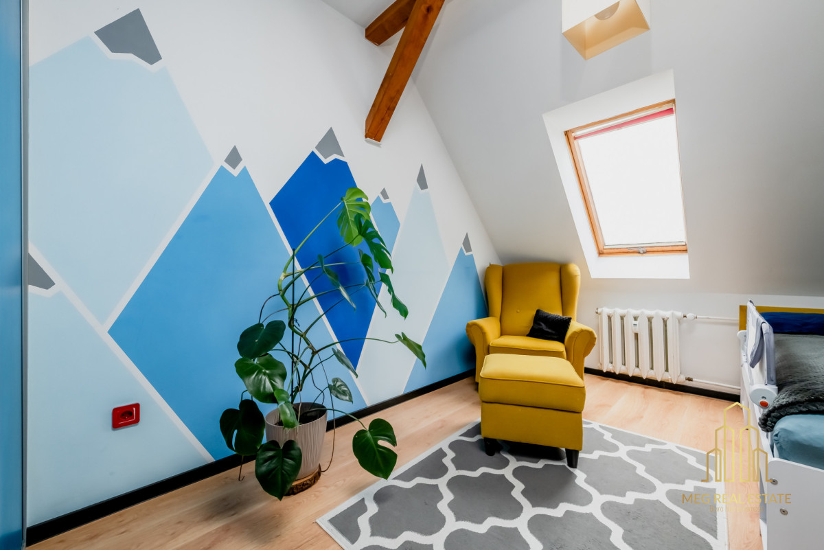 Mieszkanie składa się z salonu, oddzielnej kuchni z dużą jadalnią, 2 sypialni oraz łazienki z WC. Poddasze zagospodarowane zostało na sypilnie.